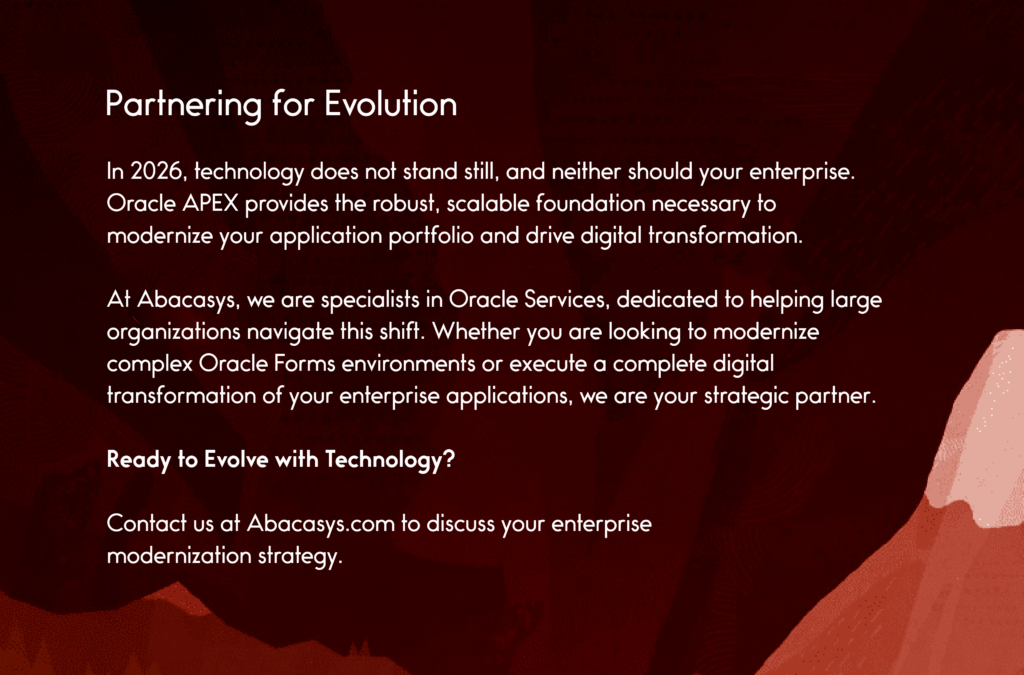 The Enterprise Shift: Do not rewrite your Oracle Forms monolith overnight. Use APEX to modernize specific modules (e.g., “Inventory Management”) one by one.